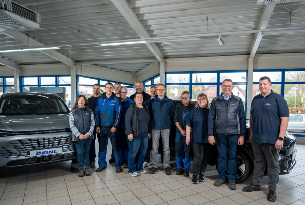Das Team der Auto Deinl GmbH steht gesammelt neben einem ihrer Fahrzeuge